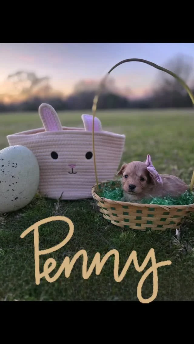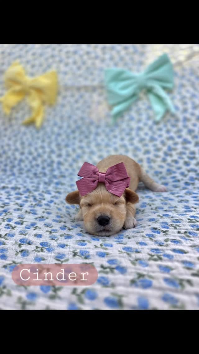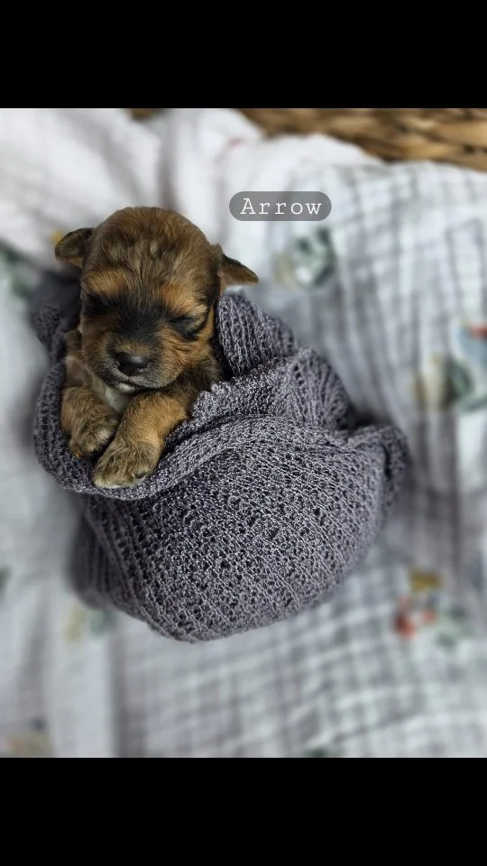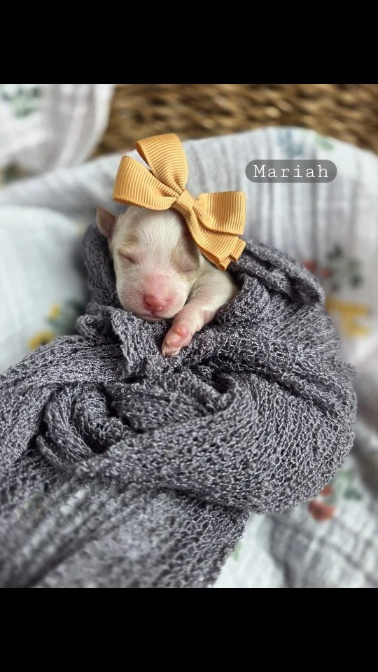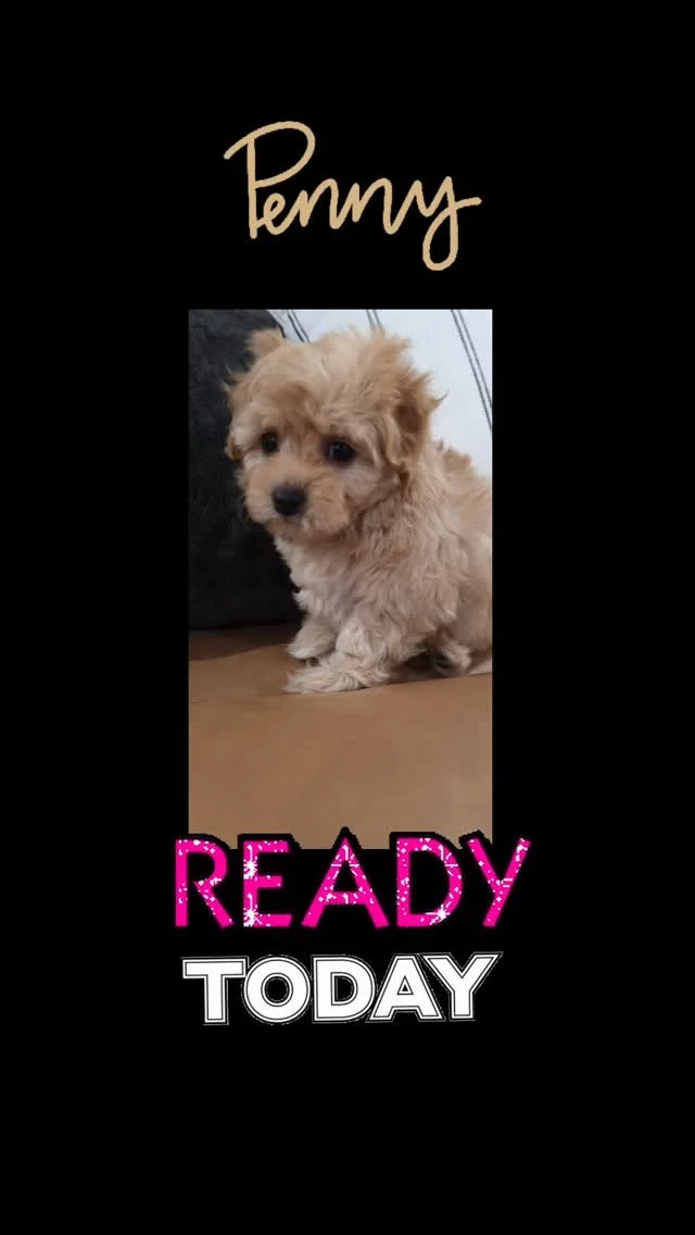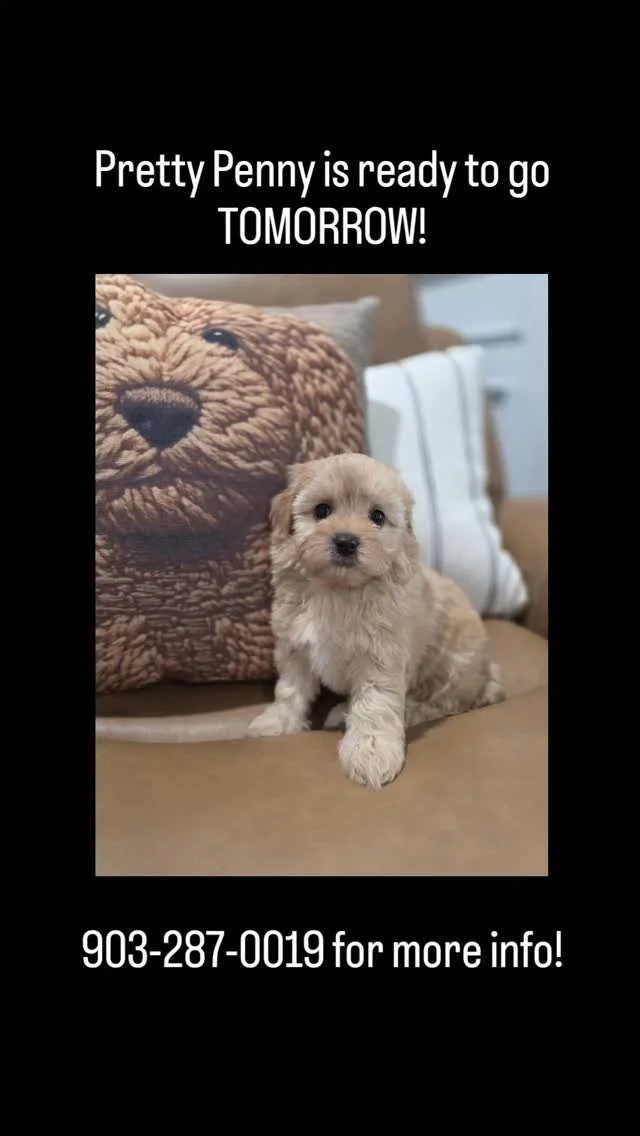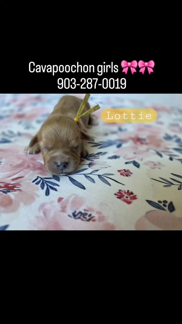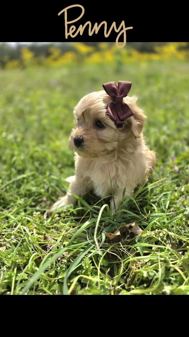 A cute brown puppy with curly fur and a purple bow in its hair, sitting on a couch with a patterned cushion in the background.