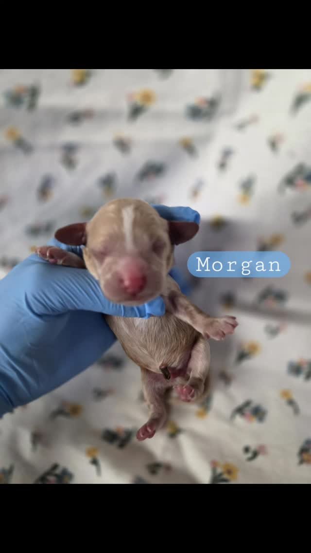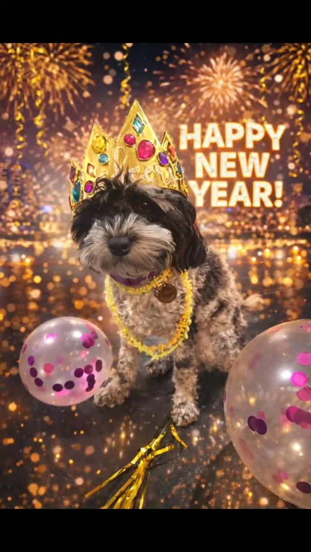 A cute, fluffy puppy with brown, black, and white fur looking into the camera, standing on a metal bench with a bright, green window in the background.