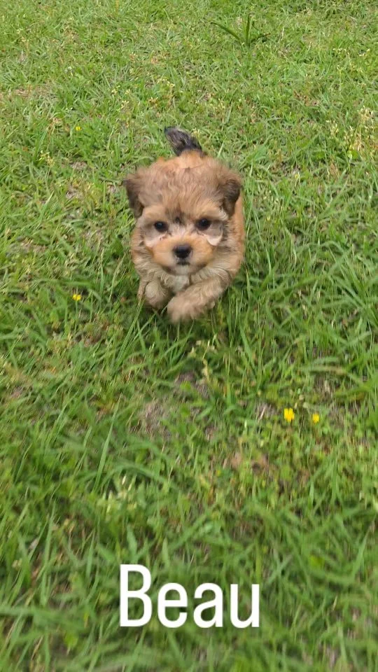Cute black and gray puppy sitting on grassy field, looking at the camera.