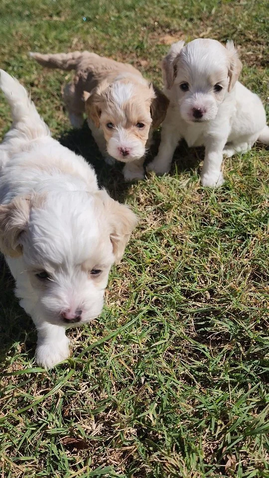 Two small puppies running on green grass, one with a curly brown coat and the other with a white coat with brown patches.