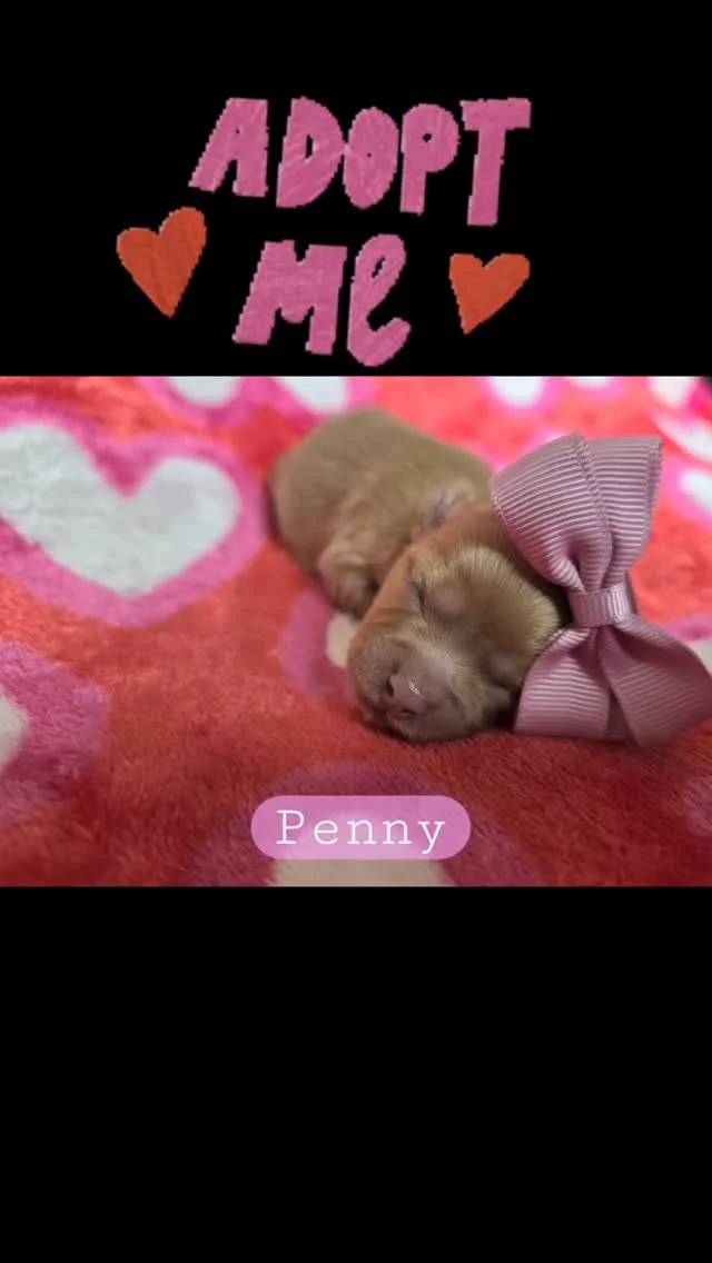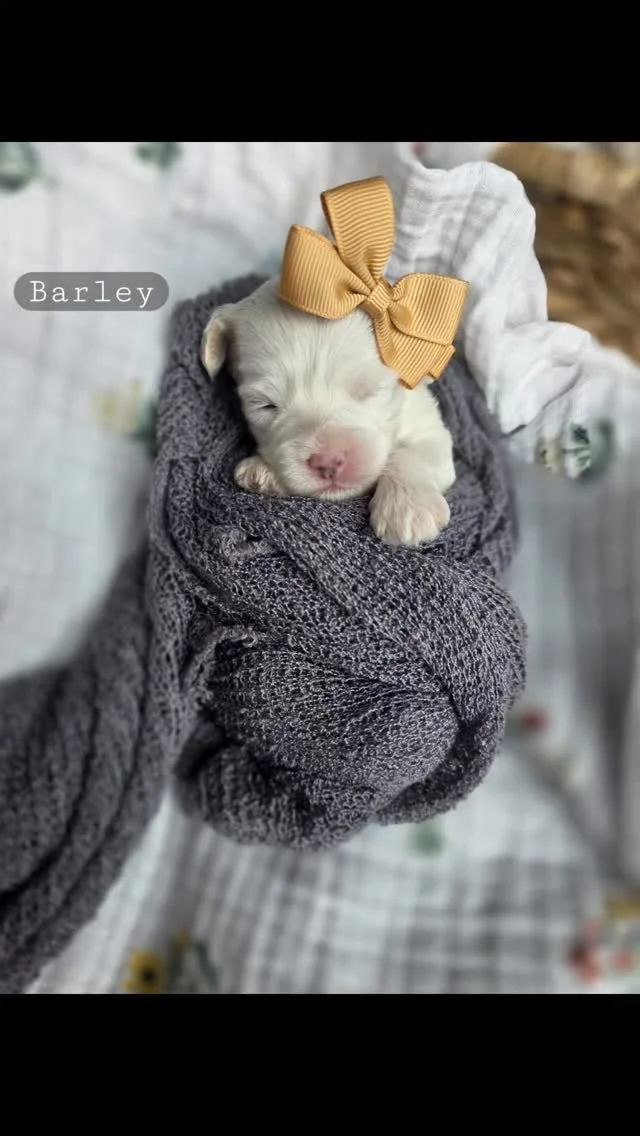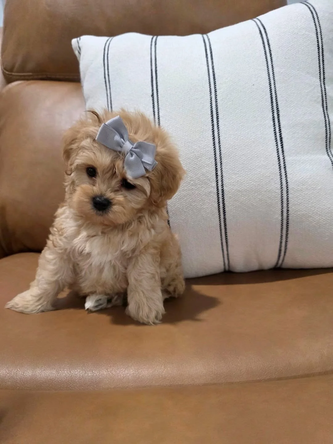 A cute brown puppy with curly fur and a purple bow in its hair, sitting on a couch with a patterned cushion in the background.