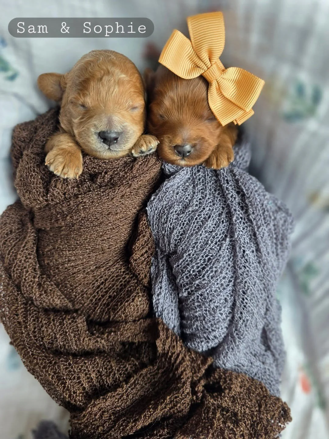 Adorable beige curly-haired puppy sitting on a cream blanket on a couch, with a decorative pillow and a living room background.