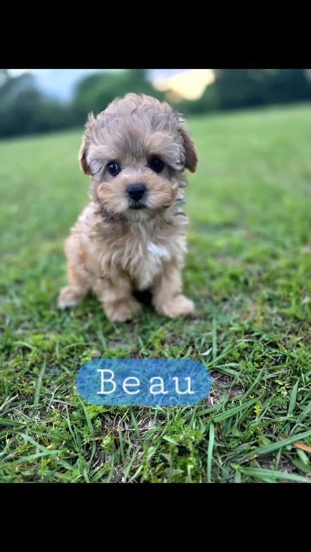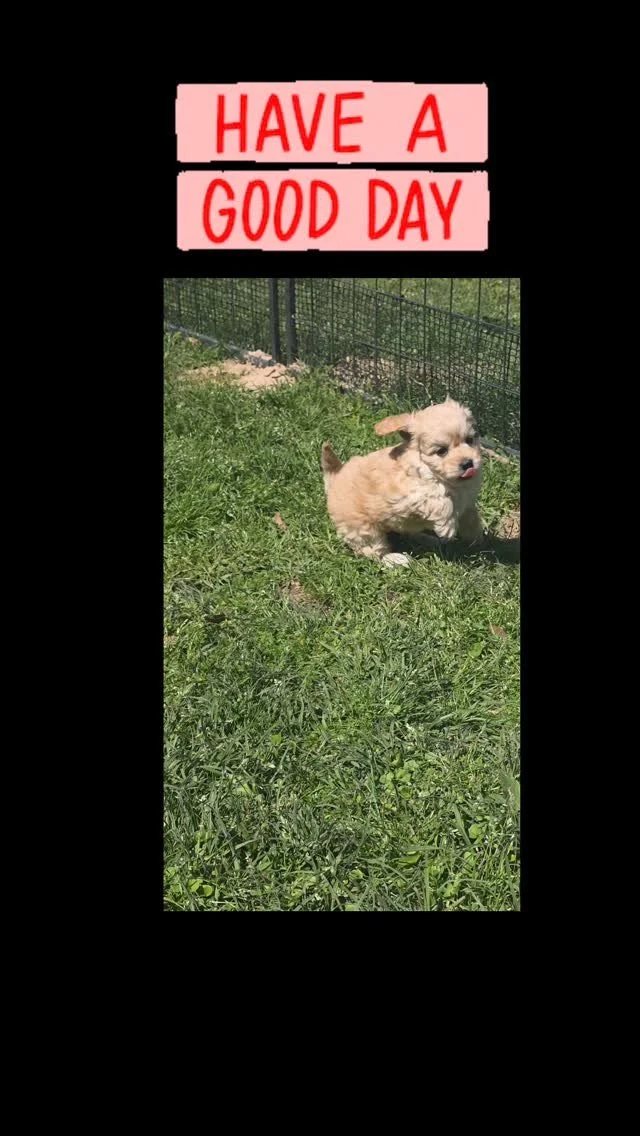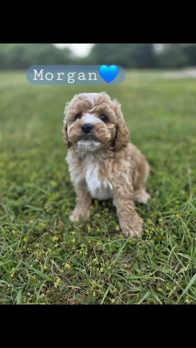Blue circular badge with white text that reads "Respected Responsible Breeding Program," "Good Breeder," "Good Dog," and "GoodDog.com." There is a paw print in the center and a ribbon at the bottom with "Cavapoochon Central."