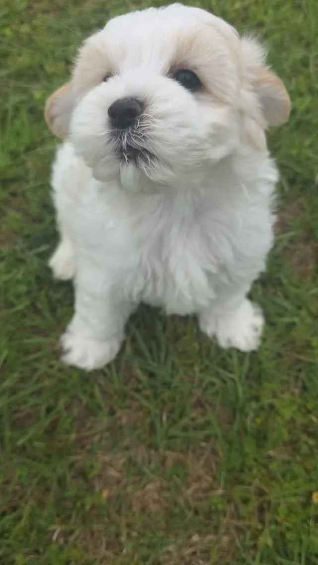 Cute, fluffy light-colored puppy standing on pine straw in front of a large green plant with broad leaves, with a house and window in the background.
